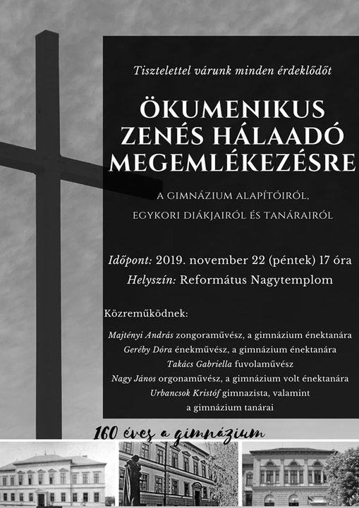 A Horváth Mihály Gimnázium 160 éves évfordulójának rendezvényei lassan véget érnek. Szeretettel hívnak és várnak minden érdeklődőt, különösképpen volt és jelenlegi diákokat és tanárainkat a Zenés Hálaadó Megemlékezésre a Református Nagytemplomba. További részletek a plakáton!