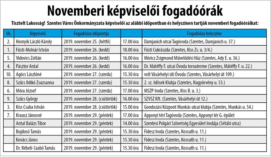 Tisztelt Lakosság! Szentes Város Önkormányzata képviselői az alábbi időpontban és helyszínen tartják novemberi fogadóóráikat: