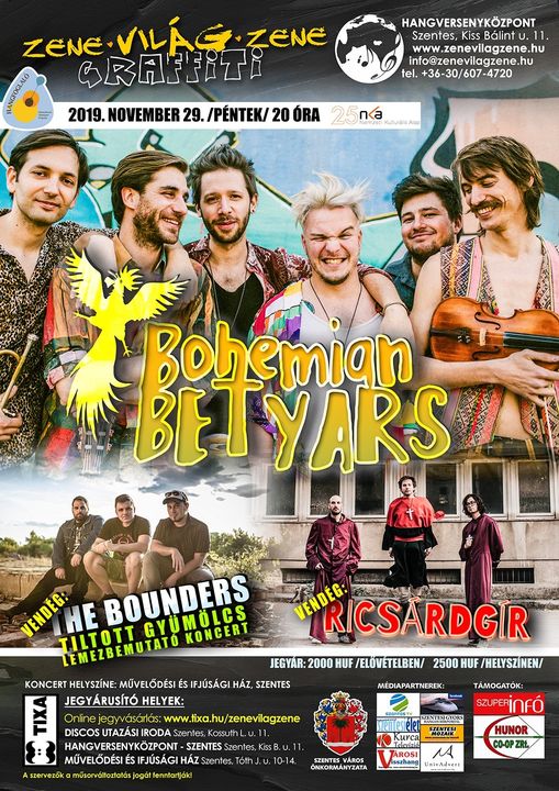 – Evés, ivás, duhajkodás, szerelem és sírva vigadás – ezekkel a szavakkal csalogatja a koncertre a közönségét az idén 10 éves Bohemian Betyars. A srácok ez idő alatt az egész világot bejárták. Bátorságuk példaértékű, a mediterrán térségben utcazenélésbe kezdtek, amit klub- majd fesztiválfelkérések követtek. Nem is csoda, hiszen elképesztő energiákat mozgósítanak a színpadon, a közelmúltban egészen Japánig vitték a Kárpát-medence jellegzetes népzenei dallamaival megtűzdelt punk-rock slágereiket, de hamarosan Oroszországban is megmutatják magukat.