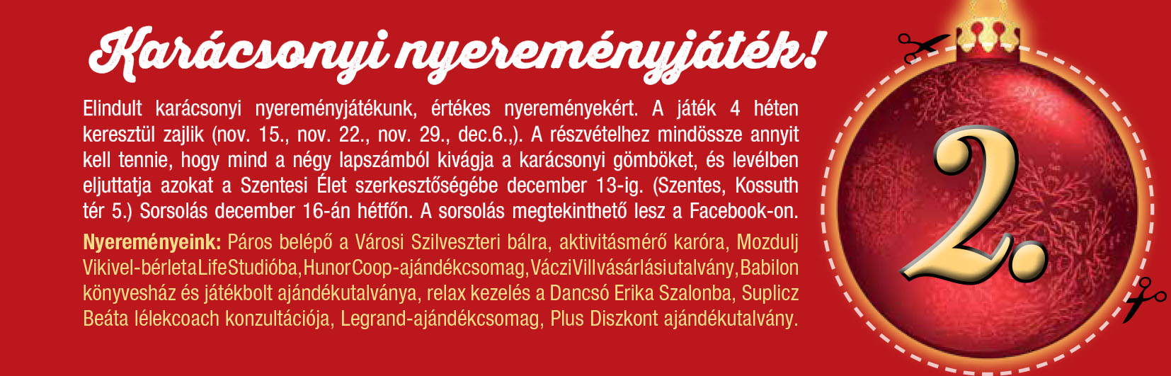 A játék 4 héten keresztül zajlik (nov. 15., nov. 22., nov. 29., dec.6.,). A részvételhez mindössze annyit kell tennie, hogy mind a négy lapszámból kivágja a karácsonyi gömböket, és levélben eljuttatja azokat a Szentesi Élet szerkesztőségébe december 13-ig. (Szentes, Kossuth tér 5.)