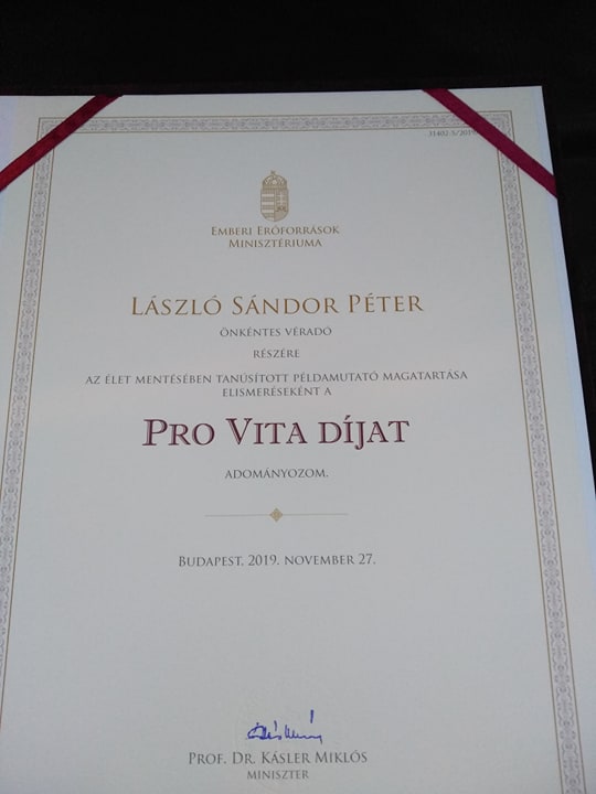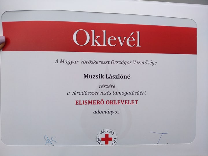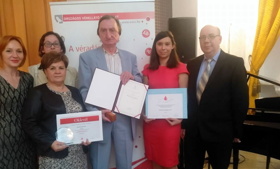 A Csongrád Megyei Dr. Bugyi István Kórház Vérellátó Osztályvezető asszisztense Muzsik Lászlóné Véradásszervezés támogatásáért elismerő oklevélben, László Sándor Péter 183x véradó Pro Vita díjban részesült.