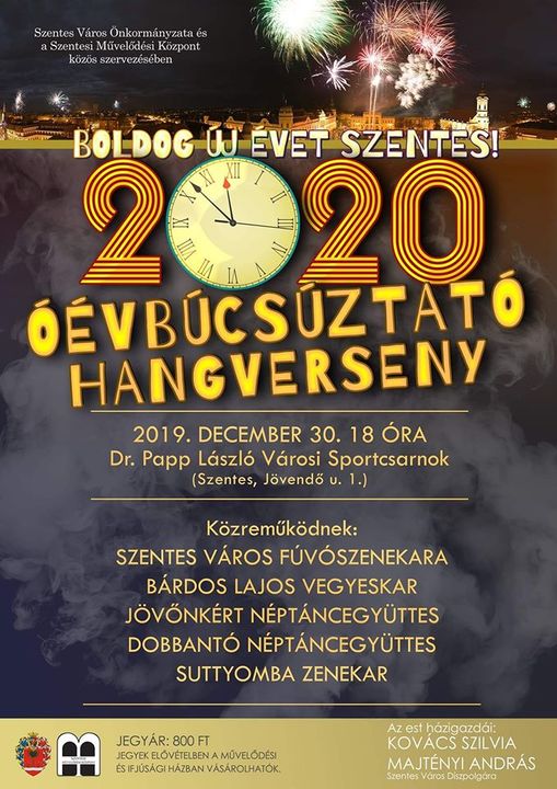 2019. december 30-án a Dr. Papp László Városi Sportcsarnokban rendezik meg a város óévbúcsúztató hangversenyét, melyen közreműködik Szentes Város Fúvószenekara, a Bárdos Lajos Vegyeskar, a Jövőnkért Néptáncegyüttes, a Dobbantó Néptáncegyüttes és a Suttyomba Zenekar. Az est házigazdái: Kovács Szilvia és Majtényi András