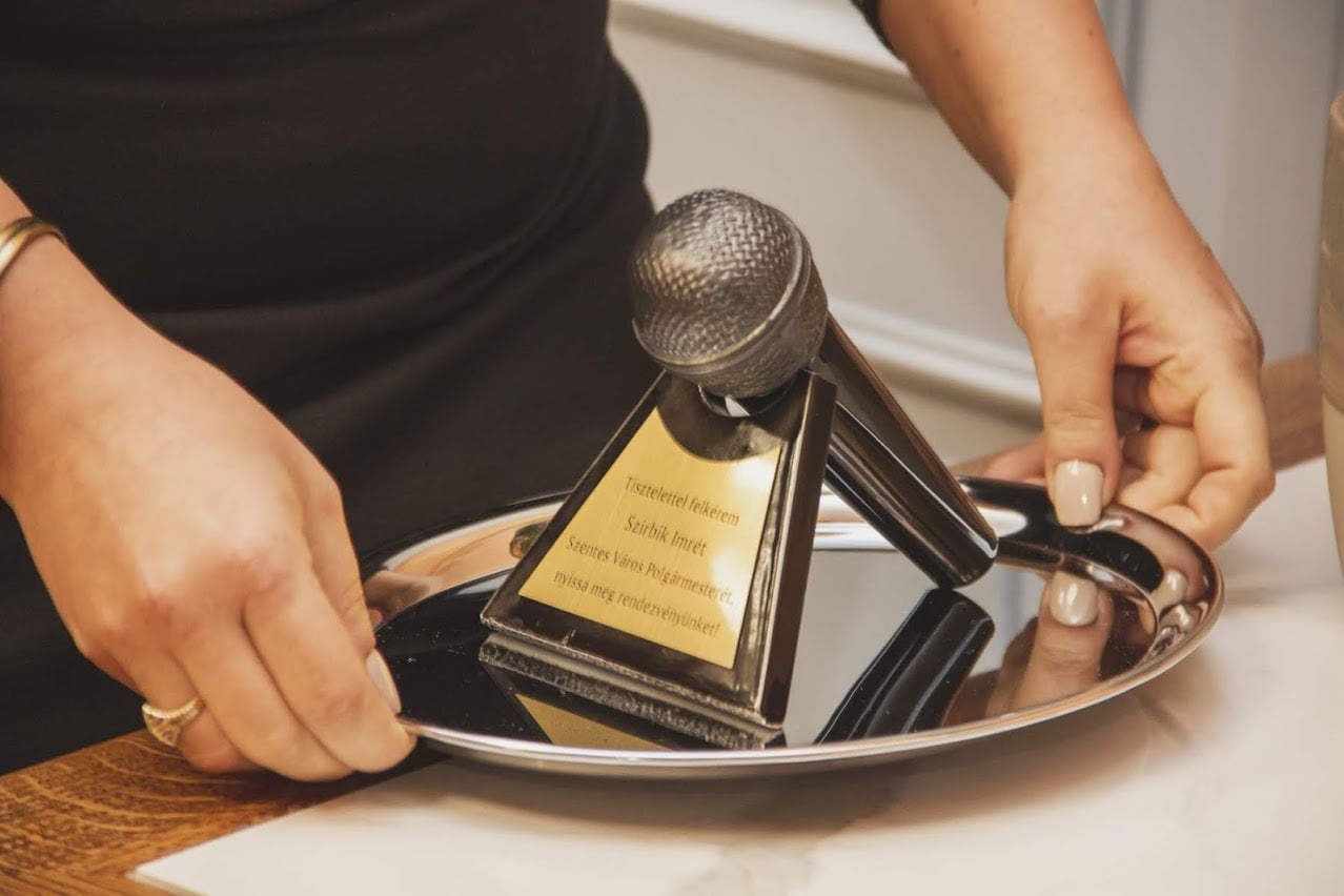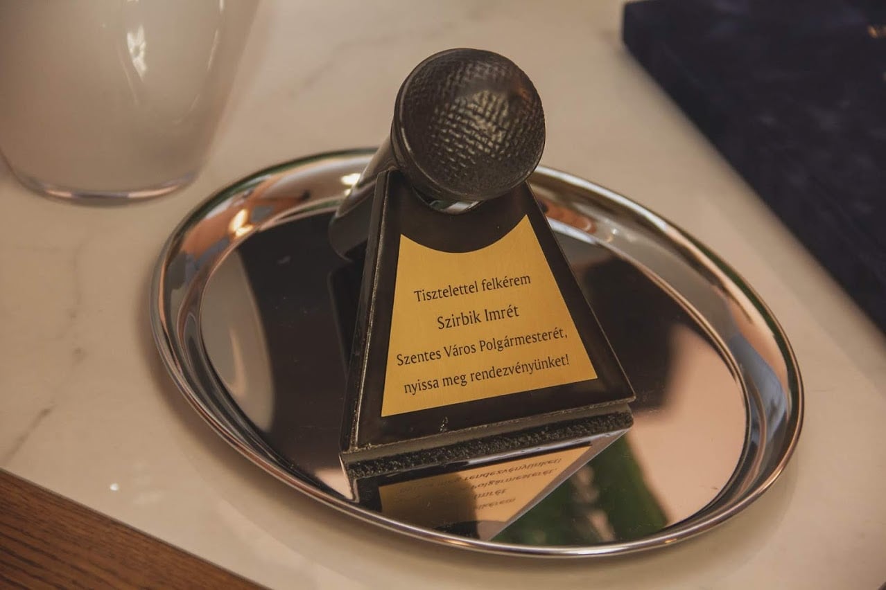 A rendezvények megnyitóján, a köszöntő beszédek többsége mikrofonba mondva jutott el minden hallgatóhoz. Ezért egy kerámia mikrofont is csináltattunk, melyre a mindig elhangzott felkérő szöveget gravíroztattuk: Tisztelettel felkérem Szirbik Imrét, Szentes város polgármesterét, nyissa meg rendezvényünket.