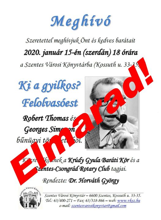 „Értesítjük kedves Közönségünket, hogy a Krúdy Gyula Baráti Kör ‘Ki a gyilkos?’ címmel a könyvtárban ma estére meghirdetett felolvasóestjét betegség miatt későbbi időpontra halasztjuk!”