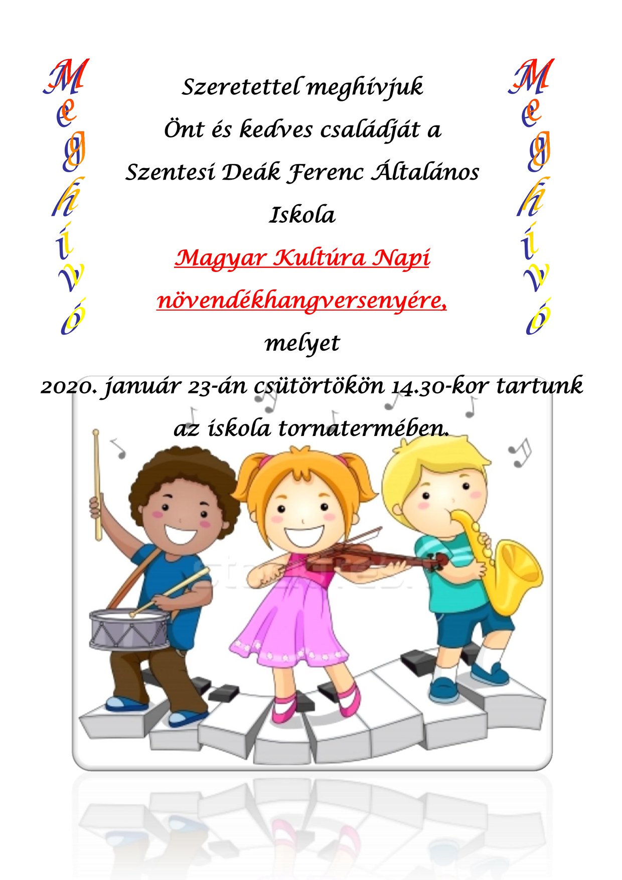 2020. január 23-án délután 14 óra 30 perckor kezdődik a Szentesi Deák Ferenc Általános Iskolában a Magyar Kultúra Napi növendékhangverseny.