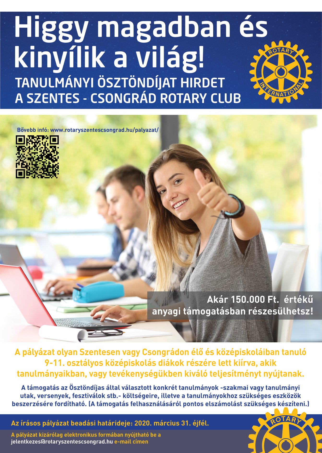 Elszánt vagy? Terveid vannak? Segítség kell, hogy elérd azt? Íme a Szentes Csongrád Rotary Club ösztöndíjpályázata, melyre szentesi és csongrádi 9-11. osztályos középiskolai tanulók pályázhatnak!
