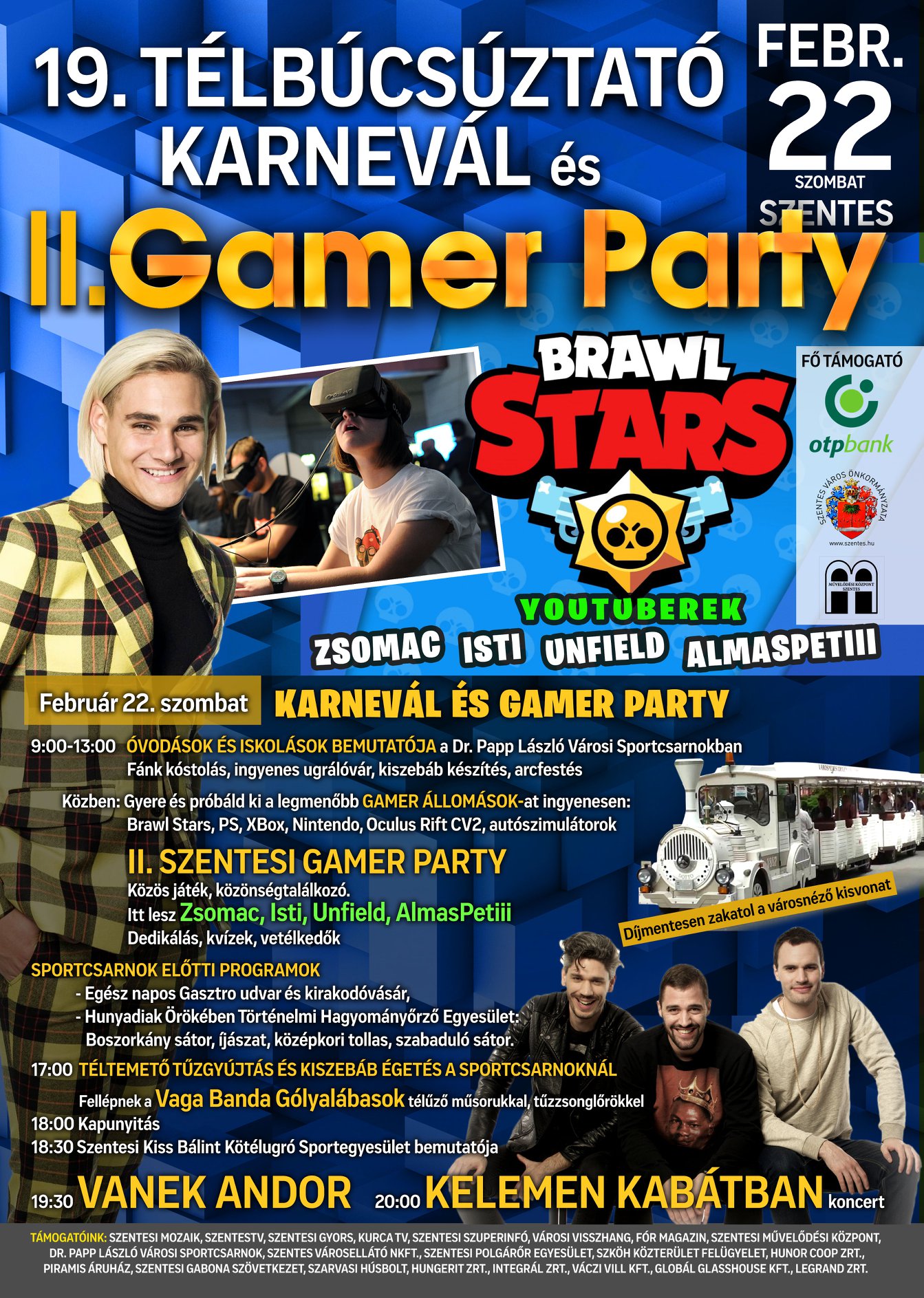 A bemutatók után veszi kezdetét a II. Szentesi Gamer Party, melyben közös játék és közönségtalálkozó keretében találkozhatunk az alábbi youtuberekkel: Zsomac, Isti, Unfield, AlmasPetiii. A sportcsarnok előtti programokban egész napos gasztro udvar és kirakodóvásár, valamint a Hunyadiak Örökében Történelmi Hagyományőrző Egyesület boszorkány sátránál, íjászat, középkori tollas és szabaduló sátor várja az érdeklődőket.