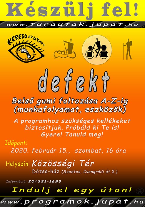 A St. Jupát Sportegyesület „Készülj fel!” sorozatában Defekt / Kerékpár belső gumijának foltozása A-Z-ig elnevezéssel ismeretterjesztő előadásra vár minden érdeklődőt 2020. február 15. (szombat), 16 órától a Közösségi Térbe (Dózsa-ház).