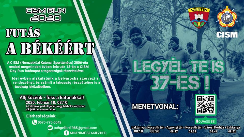 A Nemzetközi Katonai Sporttanács, a CISM – International Day of Military Sports eseménnyel ünnepeli minden évben az 1948. február 18-ai megalakulásának évfordulóját, melynek keretében a tagországok katonái világszerte több százezren egy napon futnak. Az Magyar Honvédség 37. II. Rákóczi Ferenc Műszaki Ezred katonái az idei évben, február 18-án Szentesen, a plakáton megadott útvonalon futnak (egyen sportöltözetben) és szeretnék ha minél többen csatlakoznának vagy a teljes távra, vagy csak résztávra. A csatlakozási pontok a csatolt plakáton megtalálhatóak, valamint minden egyéb fontos információ.