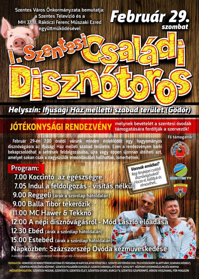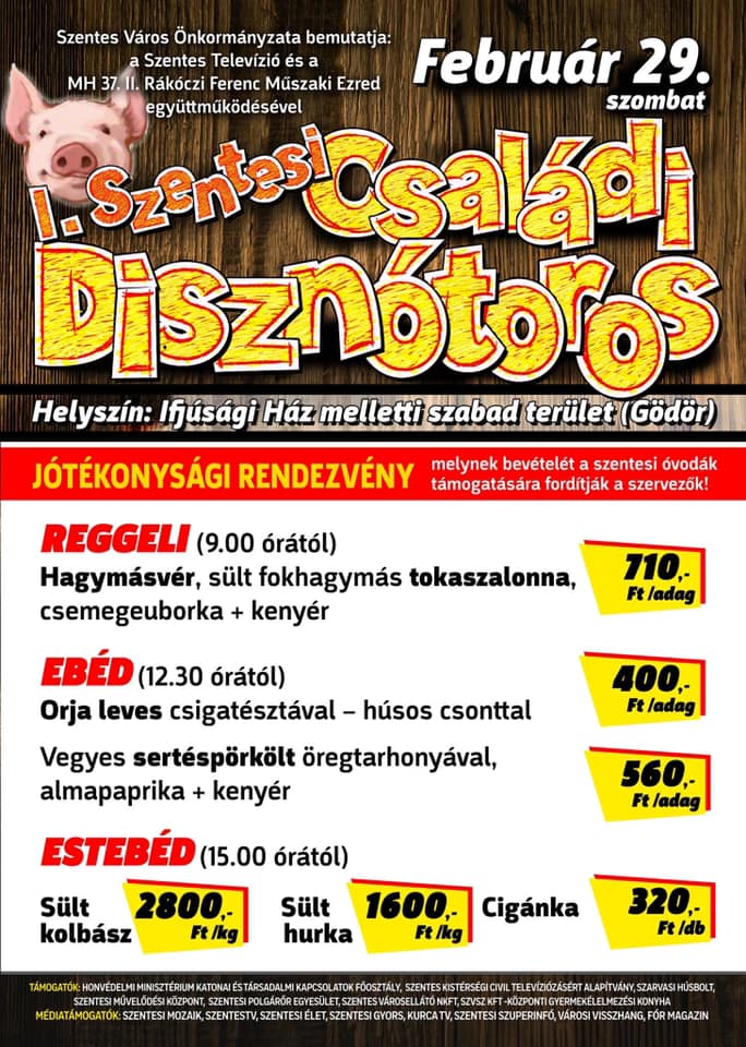 Szentes Város Önkormányzata, a Szentes Televízió, a MH 37. II. Rákóczi Ferenc Műszaki Ezred, az SZVSZ Kft.-Központi Gyermekélelmezési Konyha, a Szarvasi Húsbolt-Sőrés Zoltán és a Szentesi Művelődési Központ közös szervezésében megrendezésre kerül az I. Szentesi Családi Disznótoros Nap 2020. február 29-én az Ifjúsági Parkban!