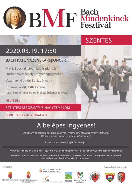 2020. március 19-én 17 óra 30 perces kezdettel Bach Katonazenekari Koncert lesz a Szentesi Református Nagytemplomban.