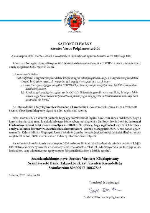 Az intézkedésből kifolyólag Szentes városában a karanténban lévő személyek száma 13-ra növekedett Szentes Város Rendőrkapitánysága által adott tájékoztató szerint – adta hírül sajtóközleményben Szabó Zoltán Ferenc polgármester.