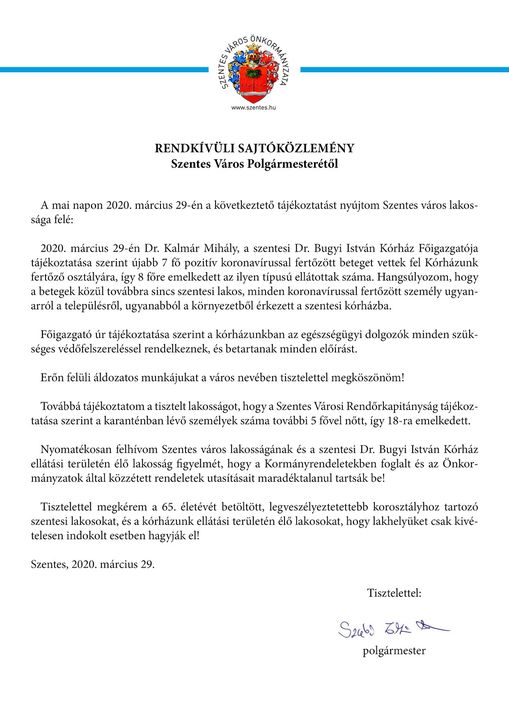 Újabb 7 pozitív koronavírussal fertőzött beteget vettek fel a a szentesi kórház fertőző osztályára