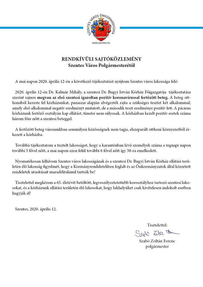 A mai napon 2020. április 12-én a következő tájékoztatást nyújtom Szentes város lakossága felé: