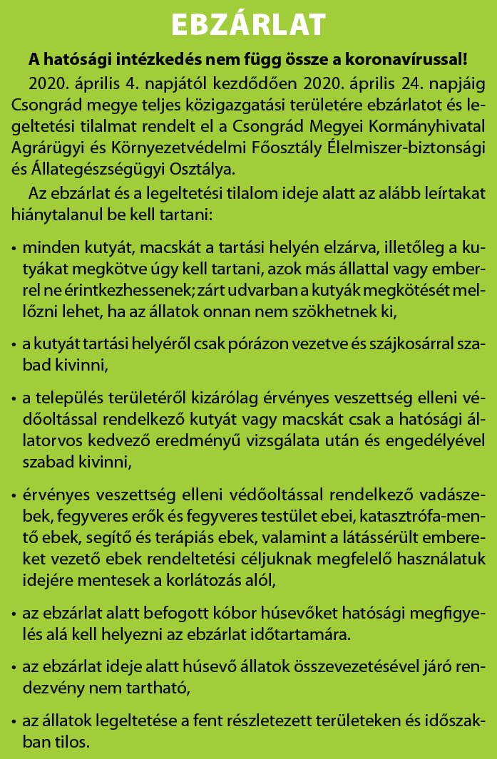 A rókák veszettség elleni vakcinázása folyik a megyében, ezért április 4-24-ig ebzárlatot és legeltetési tilalmat rendelt el a Csongrád Megyei Kormányhivatal Agrárügyi és Környezetvédelmi Főosztály Élelmiszer-biztonsági és Állategészségügyi Főosztálya. Sipos Olga, a Kóbor Mancsok Mentéséért Alapítvány elnöke szerint ez évek óta sikeresen működik, mert a rókák 80 százaléka megeszi a repülőből kiszórt, csalieledelbe rejtett vakcinát, amelyet feltűnő, piros színű táblával jeleznek a vadásztársaságok a külterületeken. Az állatvédőtől megtudtuk, az ebzárlat nem azt jelenti, hogy a házi kedvenceket be kell zárni három hétre. Alapvetően nem a városi kutyákkal van gond, hanem a tanyákon élő, szabadon kóborló ebekkel. Fontos felhívni a figyelmet, hogy ahol nincs kerítés, ott kell elzárni vagy megkötni a kutyát. A szentesiek nyugodtan kimehetnek a Hősök erdejébe vagy a Kurca partra, lehet elég zöldterületet találni, ahol sétáltathatják kedvenceiket, de mindenképpen tegyenek pórázt és szájkosarat a kutyára, nem csak bel-, hanem külterületen is.