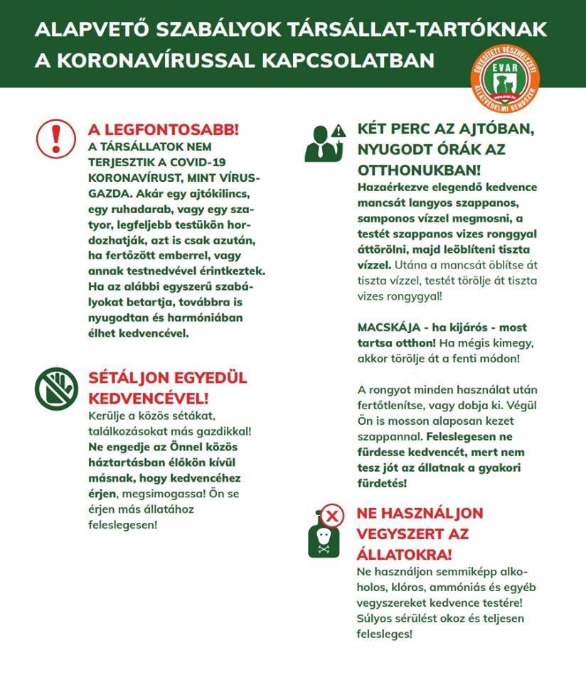 A koronavírus alapvetően eddig is ismert volt, a legtöbb társállatnak megvan a koronavírus betegsége, és ezeknek a gyógyszerei, a Covid19 most egy új típusa, amely az emberre veszélyes. Egyelőre csak feltételezés, de még nincs tudományos alapja annak, hogy zoonózisról van szó, tehát hogy az állatokról emberre terjed. Sipos Olga azt javasolja mindenkinek, hogy pórázon sétáltassa a kutyáját, a zacskó mellett vigyen magával nedves törlőkendőt – amivel hazaérve áttörli az eb lábát – kézfertőtlenítőt, ne menjen kutyafuttatóba, ne simogassa más ember a kedvencét és tartsa be az előírt másfél-kétméteres távolságot.