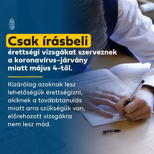 Csak írásbeli érettségi vizsgákat szerveznek a koronavírus-járvány miatt május 4-től. Kizárólag azoknak lesz lehetőségük érettségit tenni, akiknek a továbbtanulás miatt erre szükségük van, előrehozott vizsgákra nem lesz mód.