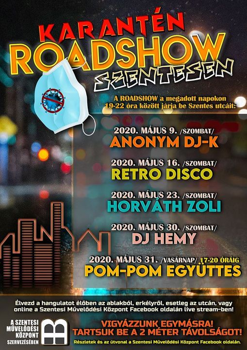 A Szentesi Művelődési Központ örömmel értesíti a szentesieket, hogy májusban Karantén Roadshow keretein belül viszik el a város több pontjára a zenét és a jó hangulatot, amit élőben az ablakból, erkélyről, esetleg az utcán, vagy online a Szentesi Művelődési Központ Facebook oldalán live stream-ben lehet követni.