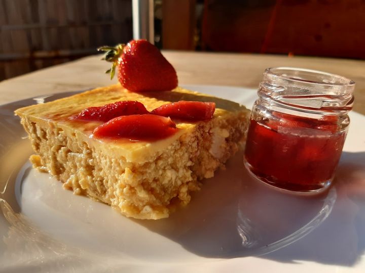 Amíg sül, elkészítheted a szamóca mártást. A szamócákat vágd ketté, majd egy lábasban kezdd el melegíteni kis lángon. Óvatosan kezdj el hozzá vizet adagolni, valamint ízlés szerint édesítsd és add hozzá a citromlevet! Akkor van kész, amikor sűrű, zselés állagot kapsz és elkezd az egész massza „rotyogni”. Hagyd kihűlni és pakold a kész túrós lepényre!