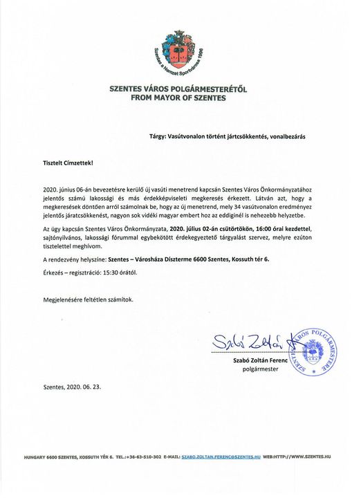 Lakossági fórummal egybekötött érdekegyeztető tárgyalásra várja az érdeklődőket Szabó Zoltán Ferenc polgármester július 2-án, csütörtökön 16 órától a városháza dísztermébe. A téma a vasúti járatcsökkentés és vonalbezárás.