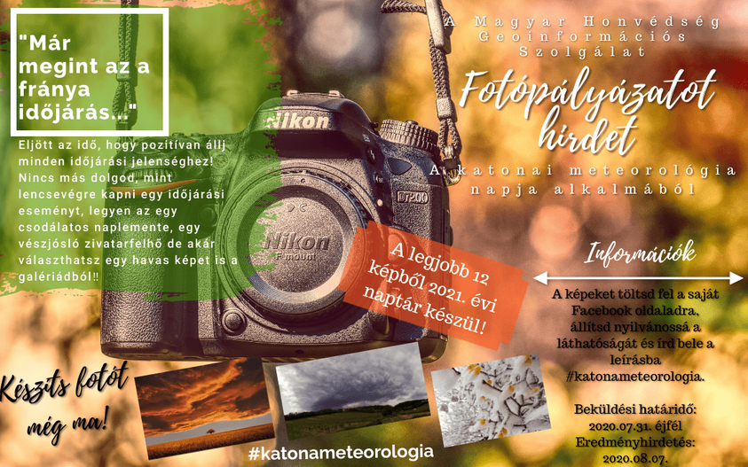 A Magyar Honvédség Geoinformációs Szolgálat a katonai meteorológia napja alkalmából fotópályázatot hirdet.📸 Nincs más dolgod, mint lencsevégre kapni egy időjárási eseményt, legyen az egy csodálatos naplemente, egy vészjósló zivatarfelhő, de akár választhatsz egy havas képet is a galériádból‼ A képeket töltsd fel a Facebook profilodra 2020. július 31. éjfélig, és állítsd a fotó láthatóságát nyilvánosra. A leírásban használd a #katonameteorologia hashtaget, így mi is láthatjuk és esélyed lesz indulni a főnyereményért. 🎁 Az általunk kiválasztott 12 legjobb képet megosztjuk a Magyar Honvédség Facebook oldalán… Továbbiak