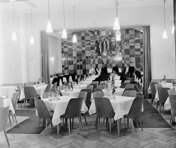 A kétéves átépítési szünet után 1969. szeptember 20-án újra meg-nyitották a Tóth József Színháztermet, mely megújult formában várta a helyi színházbarátokat. A Szentesi Felszabadulási Kulturális Hetek nyitóeseményeként avatták a teátrumot, s megkezdődött ezzel egy újabb fényes korszak, fellendült a színházlátogató kedv, bérletet hirdettek, és se szeri, se száma nem volt a fellépő neves művészeknek. Latinovits Zoltántól Korda Györgyig a művészek is megcsodálhatták az előcsarnok végfalát díszítő intarziát, Ágh Ajkelin Lajos 16 négyzetméteres faliképét. A festőművésznek már az étterembe is készült egy intarziája, a vörös teremmel összenyitott fekete teremben volt, mint azt egy 1964-es felvételen is megörökítették. fotó: Fortepan