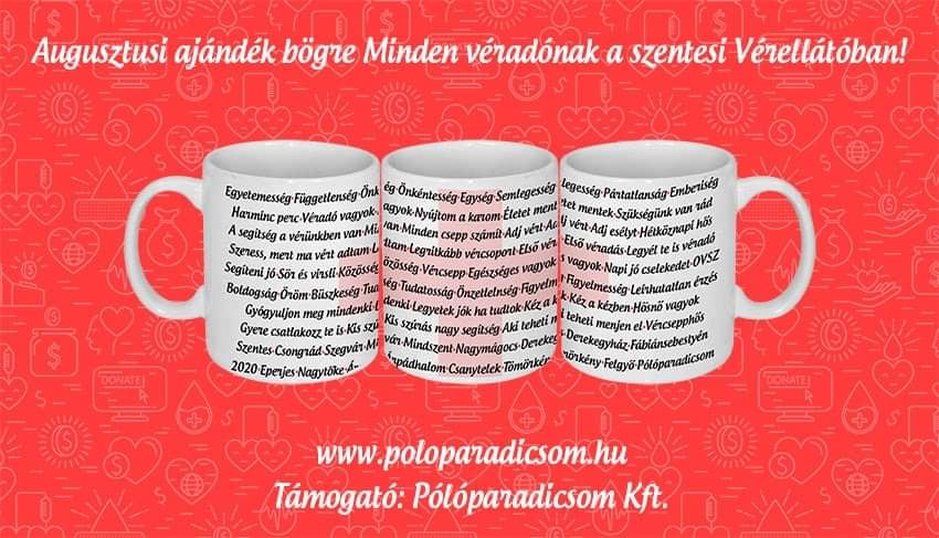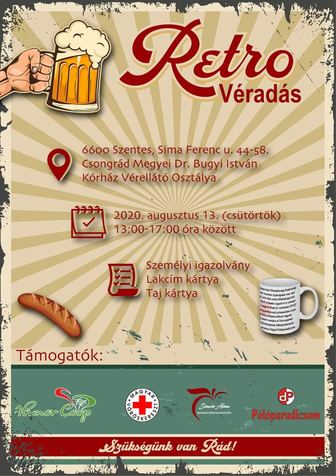 Augusztus 13-án tartja a a Magyar Vöröskereszt Szentesi Terület Szervezete a Retro véradást. Augusztusi hónapban minden intézeti véradáson megjelent véradónak egyedi bögrét adnak ajándékba.