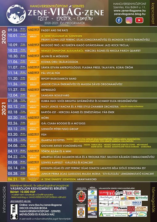 Büszkén és örömmel mutatjuk be a „Zene – Világ – Zene” koncertsorozat izgalmas, sokszínű, minden igényt kielégítő új évadát bízva abban, hogy személyesen tudunk majd találkozni koncertjeinken!