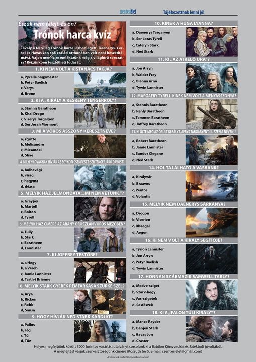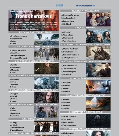 Tavaly a fél világ Trónok harca lázban égett, Daenerys, Cersei és Havas Jon sok család otthonában vált napi beszédtémává. Vajon mennyire emlékszünk még a világhírű sorozatra? Kvízünkben tesztelheti tudását.