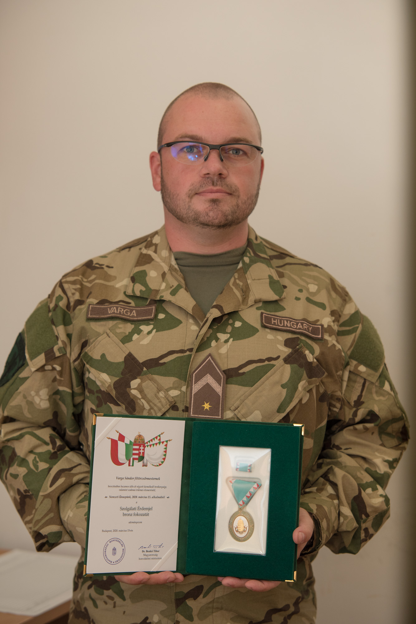 Magyarország honvédelmi minisztere a Szolgálati Érdemjel bronz fokozatát adományozta Nemzeti Ünnepünk 2020. március 15-e alkalmából Varga Sándor zászlósnak, a beosztásaiban huzamos időn át végzett kiemelkedő tevékenysége, valamint szakmai érdemei elismeréséül.