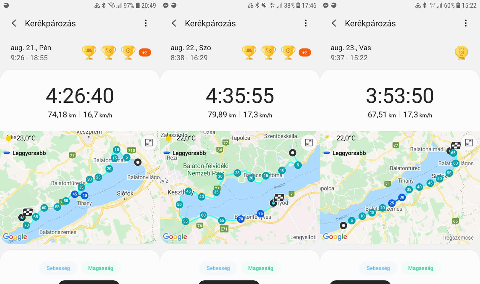 A harmadik napon már teljes egészében a déli part hosszú egyeneseinek letekerése volt a cél, (Fonyód-Balatonakarattya között) ám az időjárás már nem volt kegyes a társasághoz. Eső, napsütés, pára és meleg nehezítette a helyzetet, ami szintén egy erőpróbát jelentett a tekerés mellett. A balatonakarattyai visszaérkezés mindenkinek nagy öröm volt, egyben nagy büszkeség is.