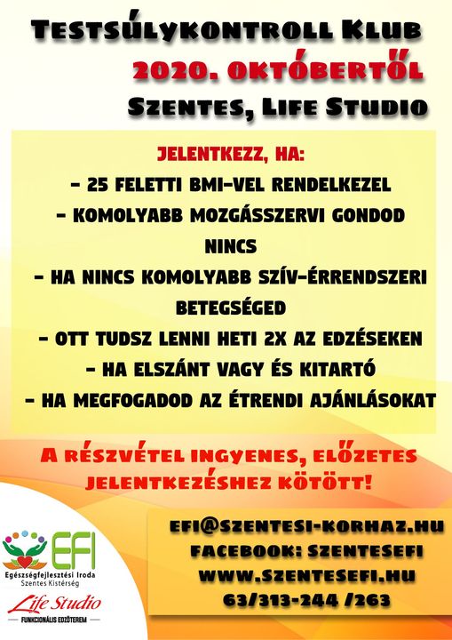 2015-ben indította útjára az első testsúlykontroll klubot a Szentesi Egészségfejlesztési Iroda, melynek célja az volt, hogy a túlsúlyos emberek egy olyan közösségre találjanak, ahol sorstársakkal, azonos céllal tudják súlytöbbletüket leadni, fittségi szintjüket növelni. A programról részletes tájékoztatást olvashatnak lapunk 12. oldalán