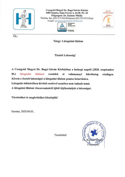 Látogatási tilalmat rendeltek el a szentesi kórházban szeptember 4-től…