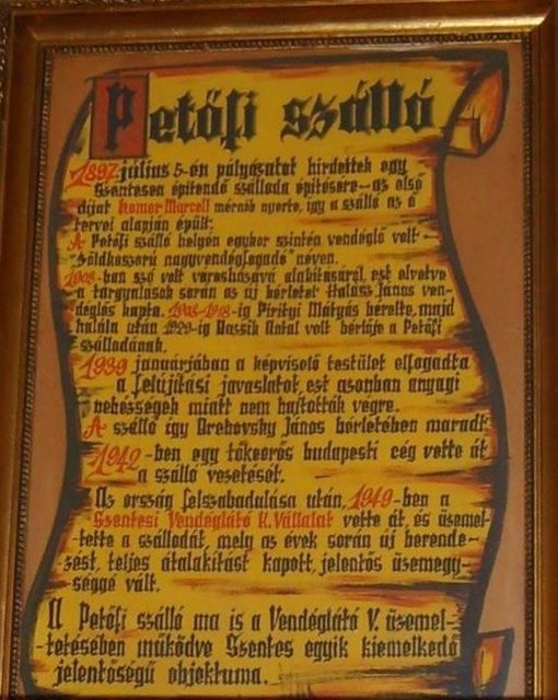 ízletes ételekkel, sütikkel. Megesett, hogy közismerten kritikus vendégükkel bizonyították, érdemes az étteremben fogyasztani. A Petőfi Cukrászda utolsó napján fotózta le Maczelkáné Rónyai Julianna ezt a míves, kézzel festett táblát, mely a süteményes pult felett foglalta össze a szálló – legalábbis a 70-es évekig íródó –históriáját, és amelynek nyoma veszett.