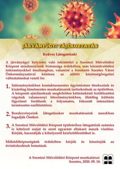 A Szentesi Művelődési Központ munkatársai arra kéri Önöket, hogy a felsorolt óvintézkedéseket legyenek szívesek betartani! Megértésüket köszönjük!