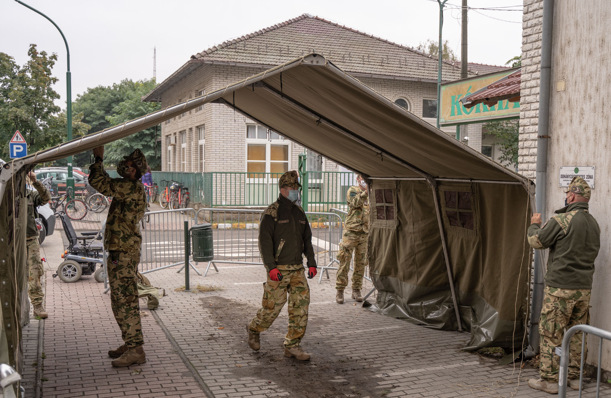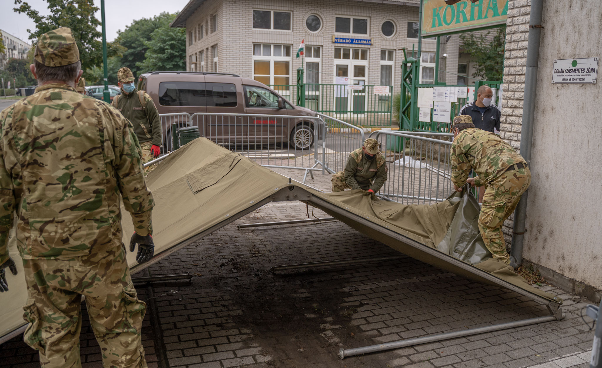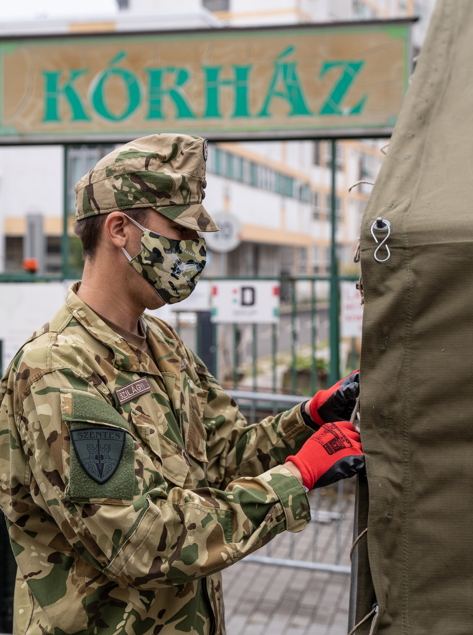 A Békés megyei Orosházi Kórház kérésére alakulatunk katonái sátrat állítottak fel a kórház bejárata elé szeptember 29-én. A sátor egy úgynevezett „váróteremként” üzemel, védve a kialakult járványügyi helyzet miatt előszűrésre várakozókat az őszre jellemző egyre hidegebb, szelesebb és esősebb időjárás ellen.