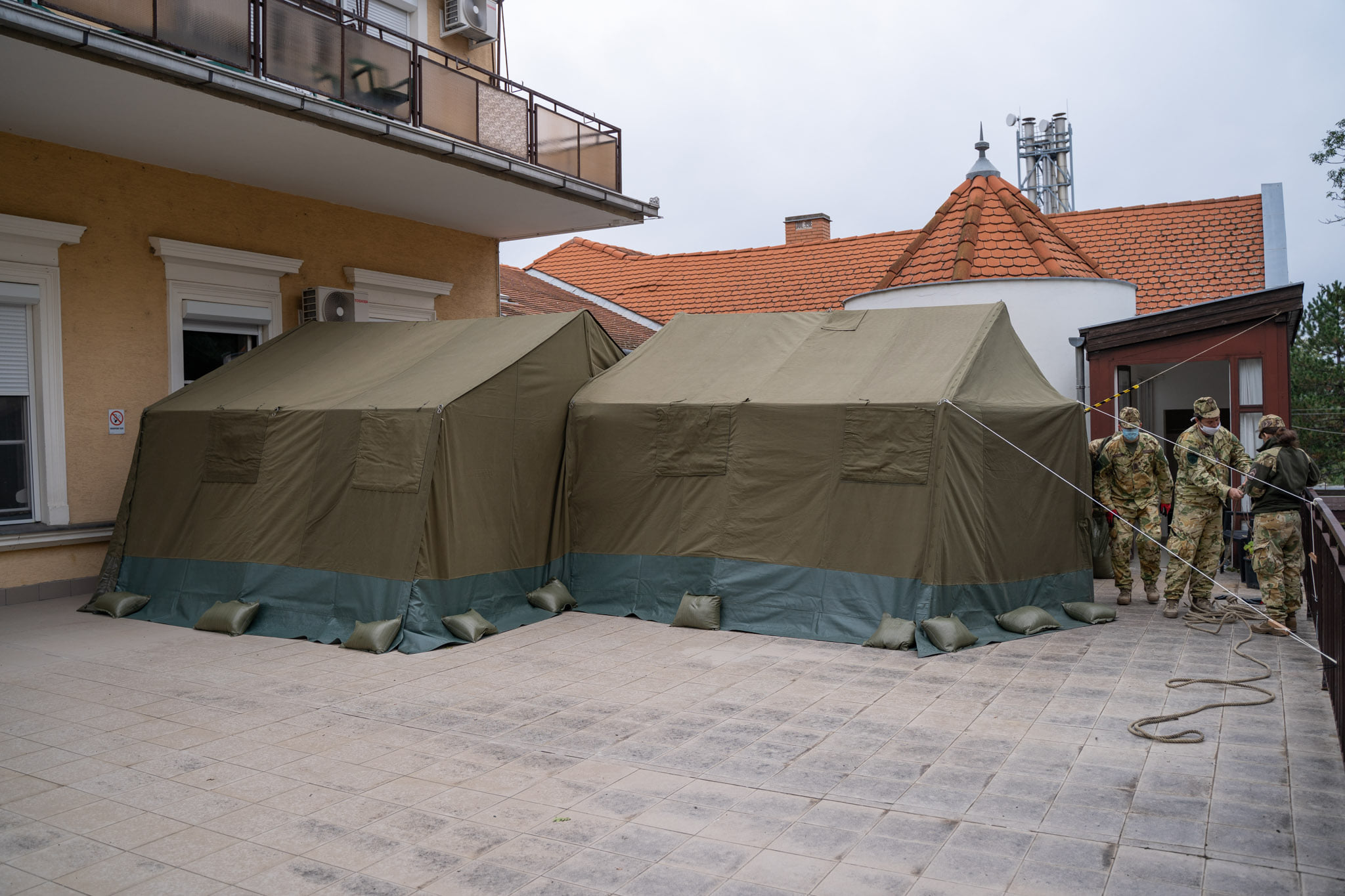 A kettő épületet összekötő teraszon felállított sátrak az ősz és a tél zord időjárása ellen nyújtanak védelmet a COVID osztály egészségügyi szakszemélyzete részére.