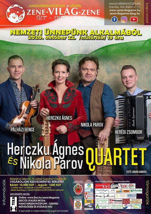 Büszkén jelentjük be, hogy október 23-i nemzeti ünnepünk alkalmából az aranylemezes, többszörös Fonogram- és eMeRTon-díjas Herczku Ágnes és szerzőtársa, Nikola Parov közös quartetje ad koncertet a Szentesi Hangversenyközpontban. A páros neve egyet jelent a kifinomult muzikalitással, a zene iránti csodálattal és tisztelettel. Hisszük, hogy koncertjükkel méltó módon tisztelgünk nemzeti ünnepünk előtt.