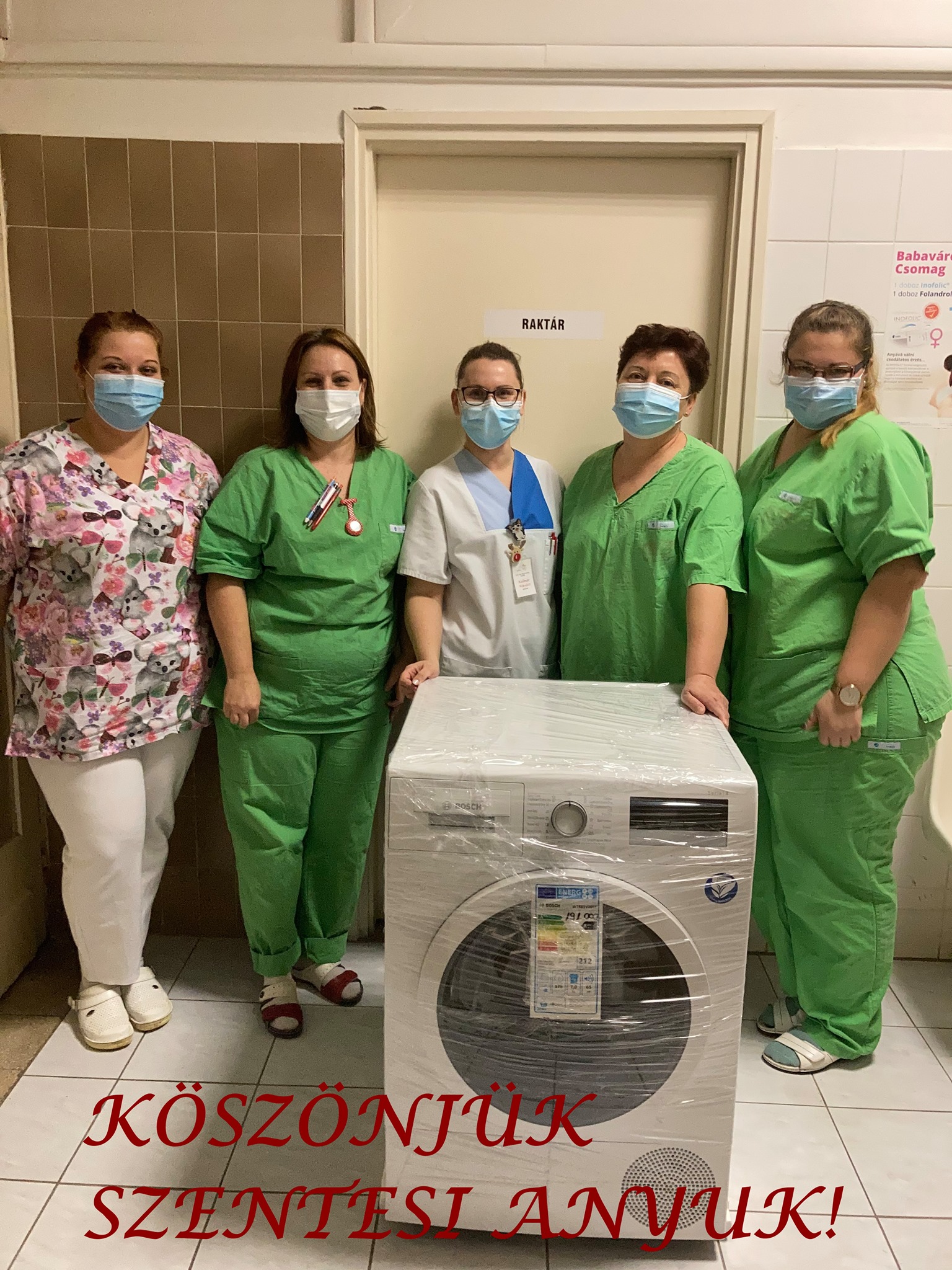 A csoportban Kardos-Papp Réka koordinálta az akciót. – Elindítottam a licitálást, és 10-15 perc alatt kialakult, hogy ezt keretek közé kell foglalni. Azért nem vittük ki a zárt csoportból, mert látszott, hogy az összeg napok alatt összegyűlhet. Egy adott helyen, lezárt dobozban gyűjtöttük az 500-1000 forintos adományokat, és 48 óra alatt összejött a 191 ezer forint az új Bosch szárítógépre. A szülészet mellett a helyi kisvállalkozásokat is szerettük volna támogatni, így a gépet nem az interneten rendeltük, hanem Csongrádon vásároltam meg szombaton, és hétfőn már ki is szállították az osztályra – újságolta örömmel Réka. A szülészet dolgozói pedig ezzel a képpel köszönték meg a gyors összefogást, az önzetlen segítséget és az adományt.