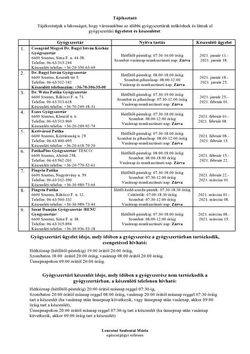 Gyógyszertári ügyelet Szentesen 2021. január 11-től március 15-ig…