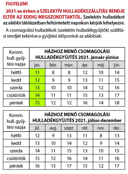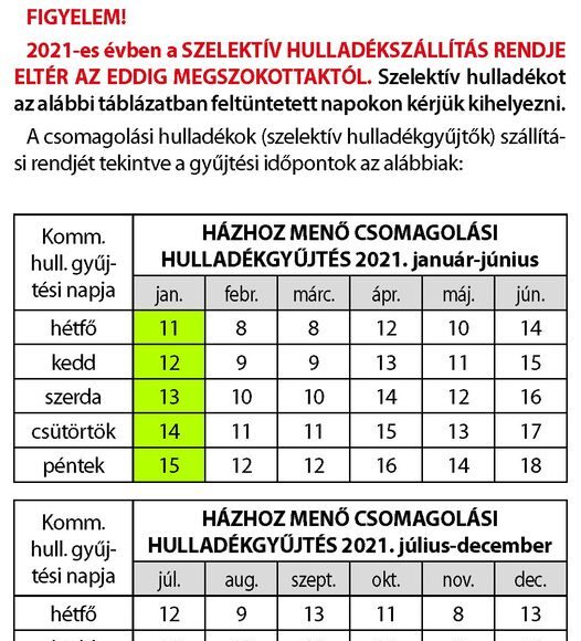 2021-es évben a SZELEKTÍV HULLADÉKSZÁLLÍTÁS REND megváltozott, az eddigi hó végi gyűjtést el kell felejteni, mert 2021-ben a hónap közepén kell kihelyezni a sárga kukákat! A jobb megjegyezhetőség érdekében: minden hónap második hétfőjének hetében kell a csomagolási hulladékgyűjtő SÁRGA kukákat kivinni azon a napon, amikor körzetünkben esedékes a szemétszállítás!