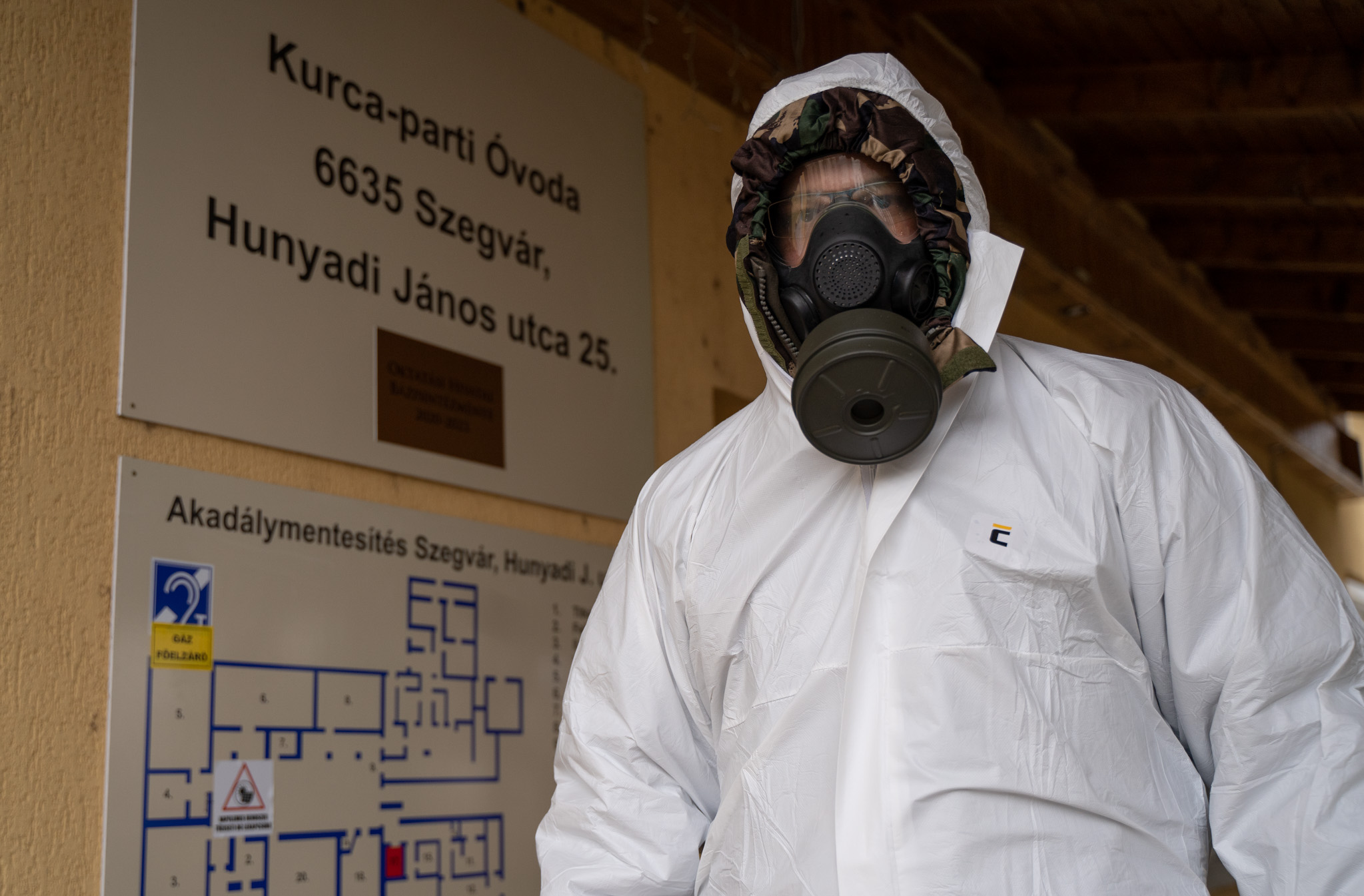 Az alakulat mentesítési feladatra felkészített katonái a délelőtt folyamán érkeztek meg Szegvárra, a Kurca-parti Óvodába, ahol a helyszínbejárást, majd az áramtalanítást követően közel 1000 négyzetméteren hajtották végre az alapos fertőtlenítést.