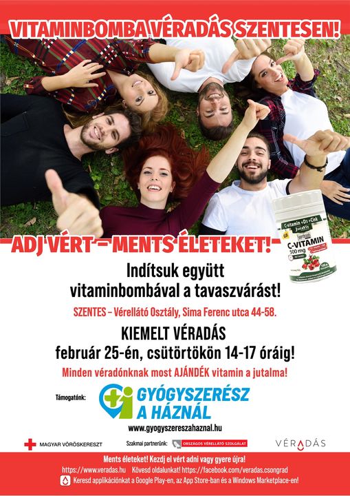 Kiemelt véradásokat tart Hódmezővásárhelyen, Makón és Szentesen eltérő időpontokban a Magyar Vöröskereszt és a Gyógyszerész a Háznál program! Vitaminbomba véradásainkra különösen azokat várjuk, akik még nem adtak vért vagy hosszú idő után újrakezdenék ezt az önzetlen tevékenységet! Rájuk számítva érhetjük el, hogy a koronavírus miatti visszaesést a véradásokban pótolni tudjuk!