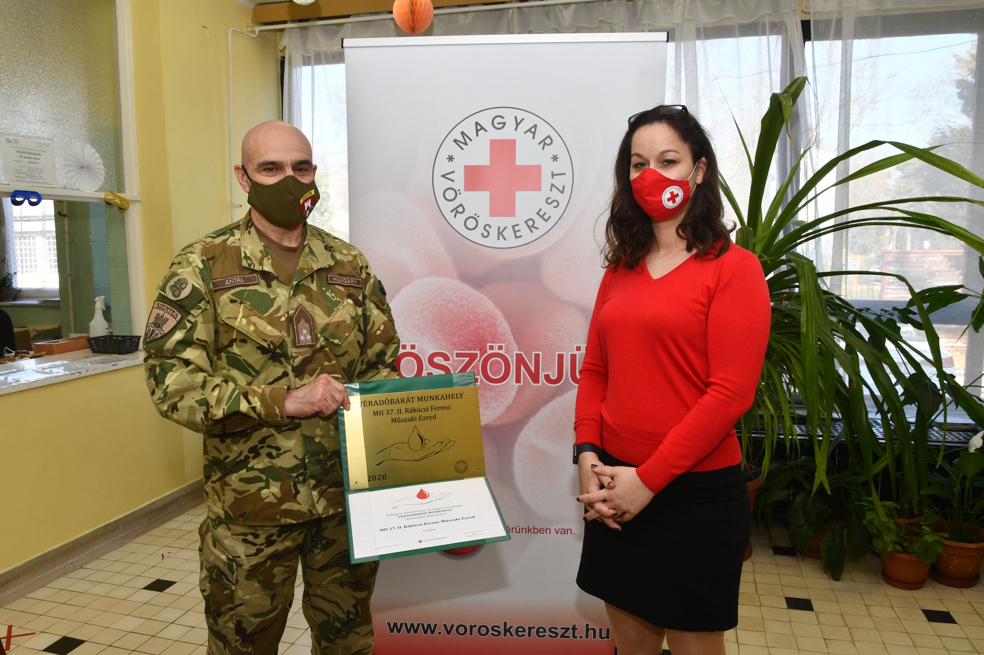 A Magyar Vöröskereszt Országos Vezetősége a Véradóbarát Munkahely kitüntető címet adományozott a MH 37. II. Rákóczi Ferenc Műszaki Ezrednek a 2020. évben. Az elismerést Sasvári Krisztina megyei igazgató adta át Antal László ezredesnek az alakulat vezetőjének. Gratulálunk!