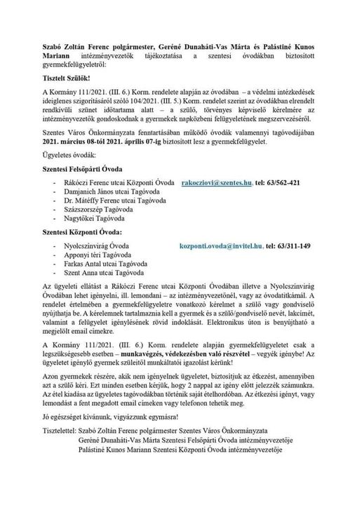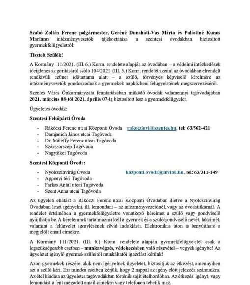 Óvodai ügyelet Szentes város fenntartásában levő óvodákban 2021. március 8-tól….