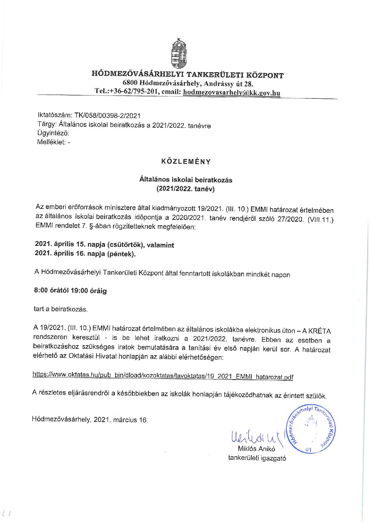 A Hódmezővásárhelyi Tankerületi Központ által fenntartott iskolákban április 15-én és 16-án reggel 8 órától 19 óráig tart a beiratkozás. Részletek a közleményben.