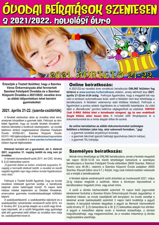 Értesítjük a Tisztelt Szülőket, hogy a Szentes Város Önkormányzata által fenntartott Szentesi Felsőpárti Óvodába és a Szentesi Központi Óvodába a 2021/2022. nevelési évre az alábbi időpontokban lehet beíratni gyermekeiket: 2021. április 21-22. (szerda-csütörtök)