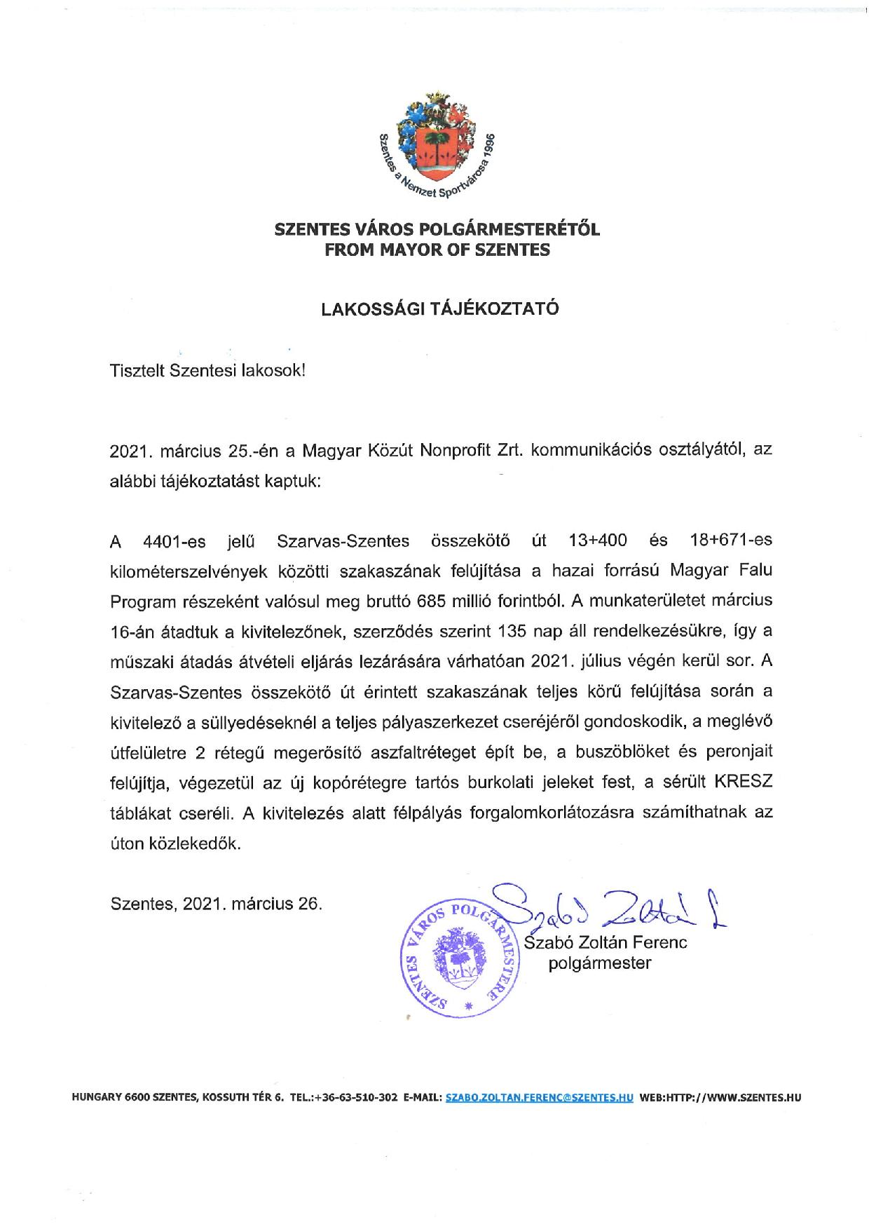 Felújítják a Szarvas- Szentes összekötő út egy szakaszát a 13-as és a 18-as kilométerszelvények között. A munkaterületet március 16-án átadták a kivitelezőnek, a felújítás várhatóan július 31-ig tart. A kivitelezés alatt félpályás forgalomkorlátozásra számíthatnak az arra közlekedők. További információk Szabó Zoltán Ferenc polgármester lakossági tájékoztatójában.