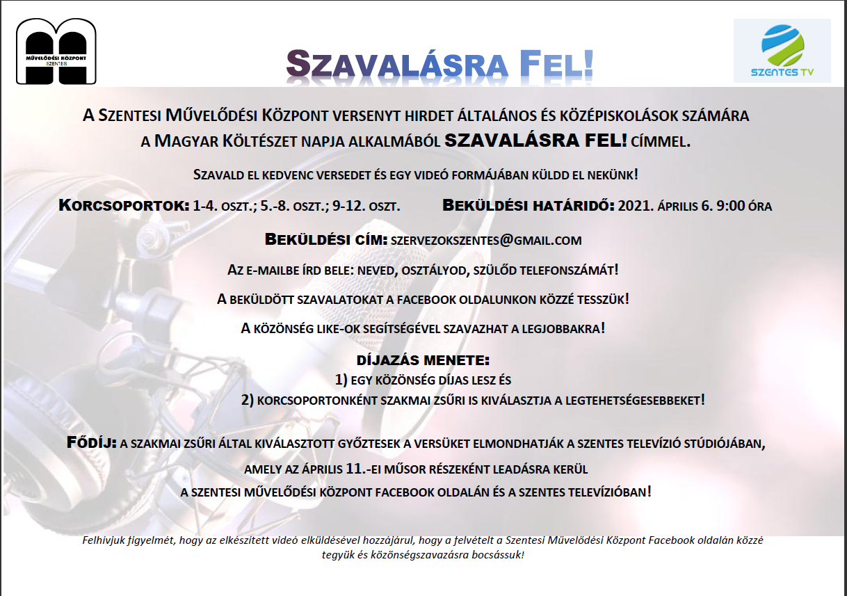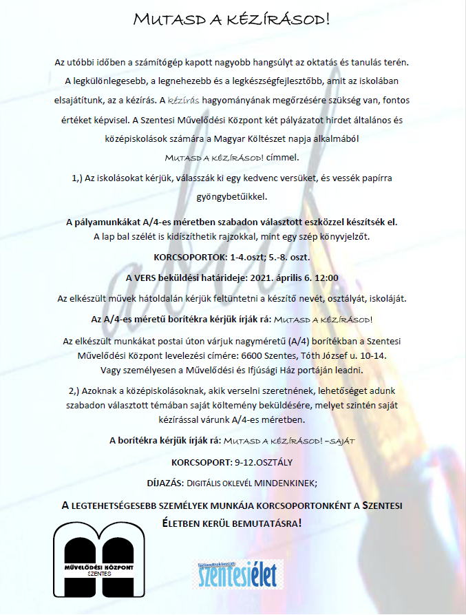 A Magyar Költészet Napja alkalmából Mutasd a kézírásod! és Szavalásra fel! pályázat pályamunkáit április 6-án délig várjuk a szervezőkszentes@gmail.comra és a Tóth József u.10-14.alatt.