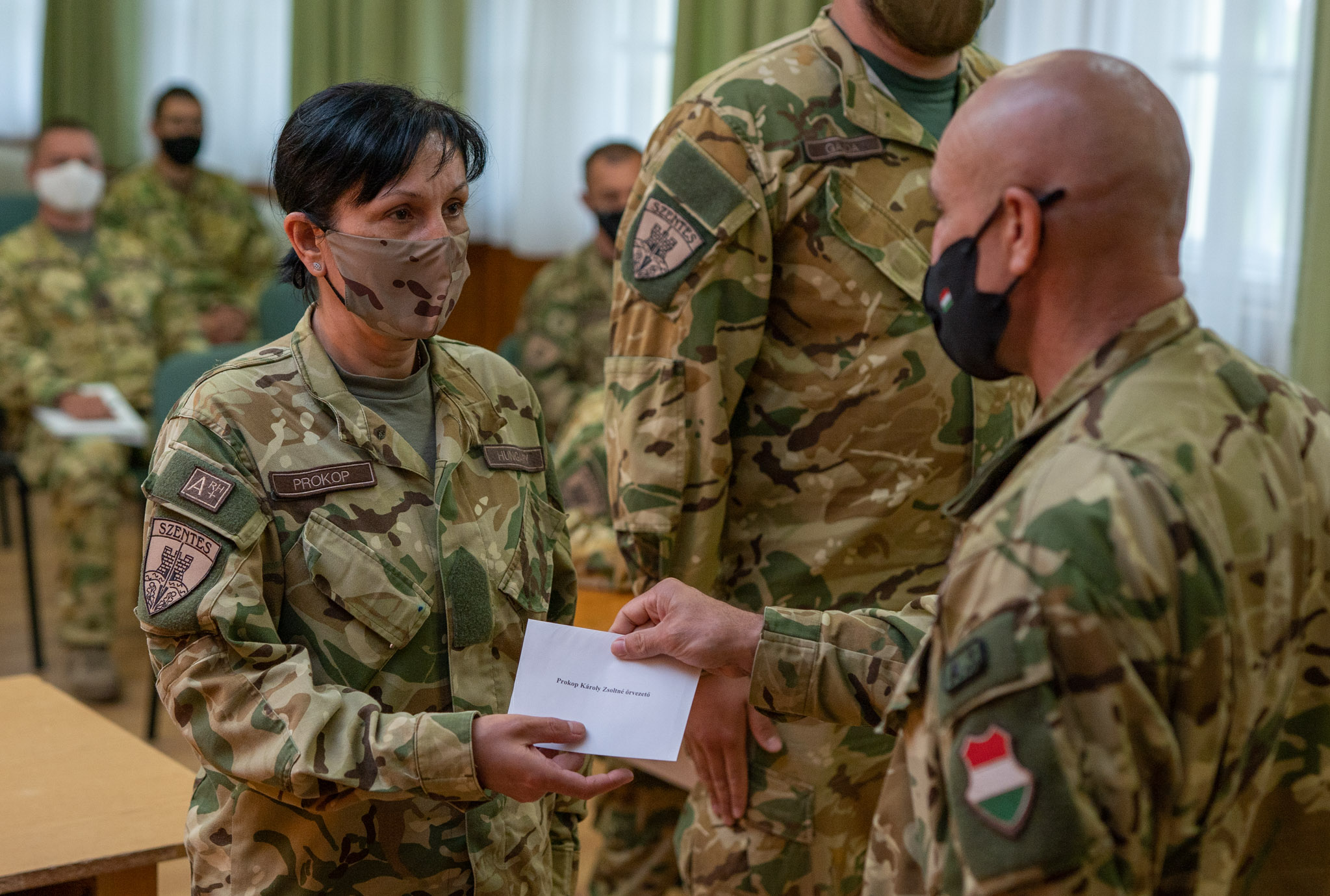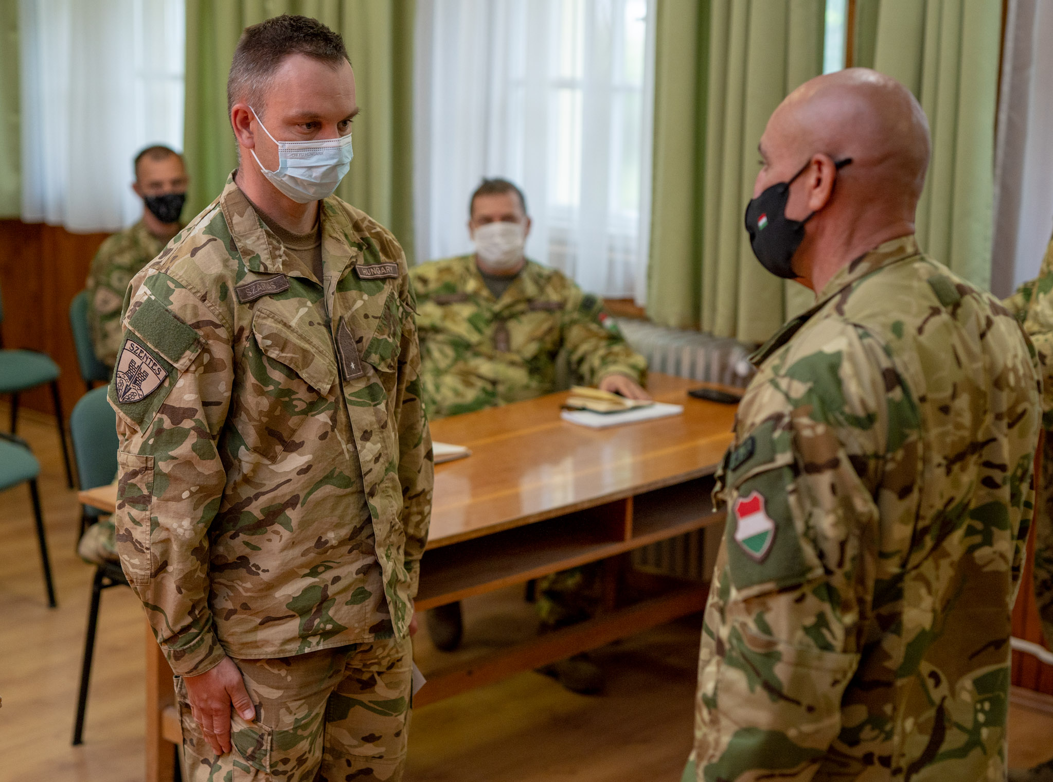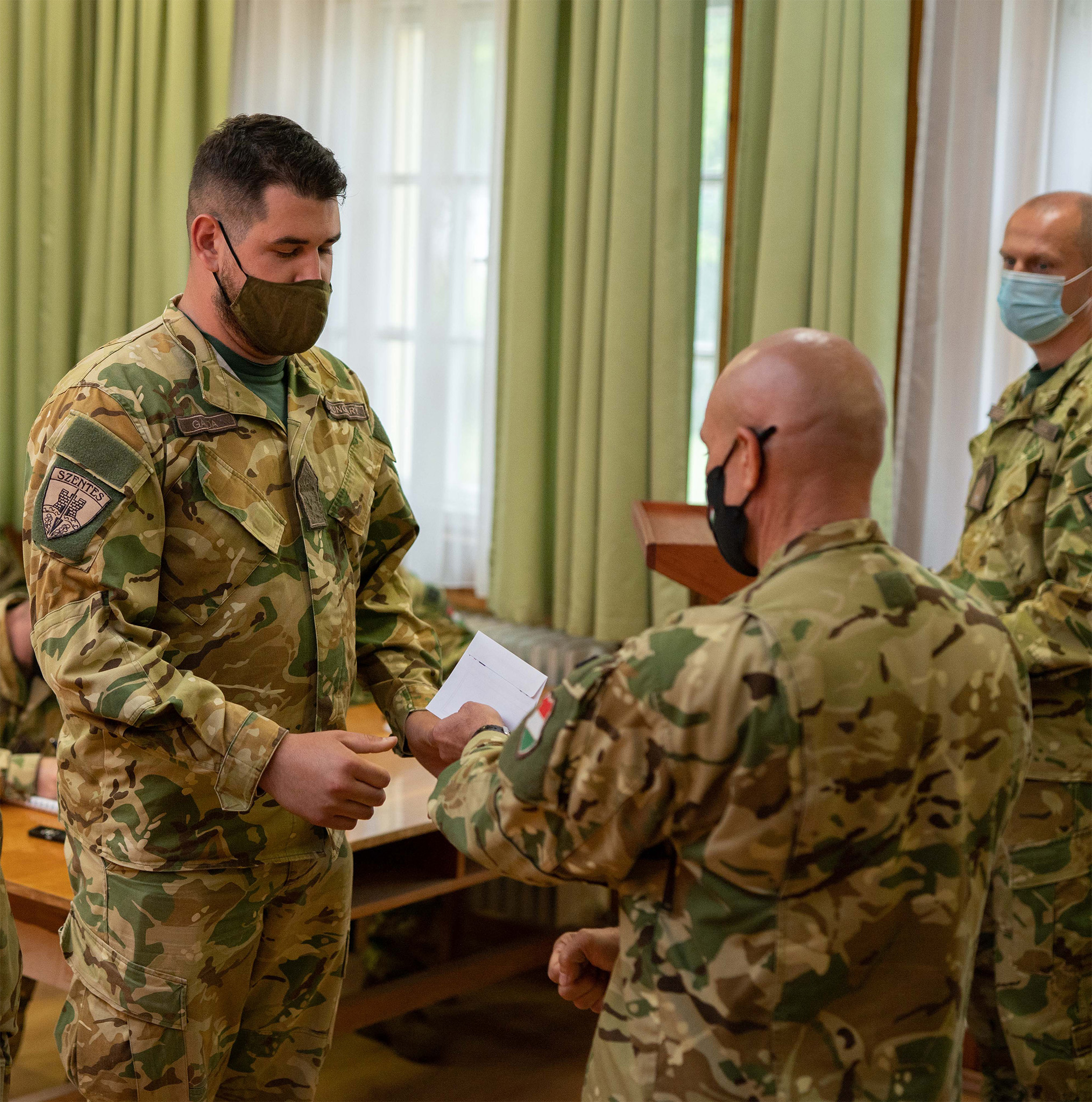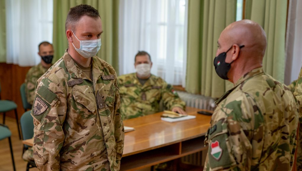 Antal László ezredes, a műszaki ezred parancsnoka a szigorítások miatt szűk körben, de személyesen gratulált a magasabb rendfokozatba előléptetett katonáknak.